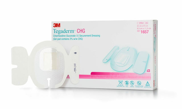 The 3M Tegaderm™ CHG IV Securement Dressing (1657) combines transparent adhesive technology with the antimicrobial protection of chlorhexidine gluconate (CHG). This waterproof, breathable dressing helps reduce the risk of catheter-related bloodstream infections while providing securement for IV sites, central lines, PICC lines, and other vascular access devices.