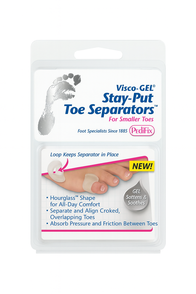 Made from soft, medical-grade Visco-GEL®, they gently cushion and separate toes while absorbing shock and reducing discomfort. The Stay-Put design keeps the separator securely in place without slipping, even inside shoes.